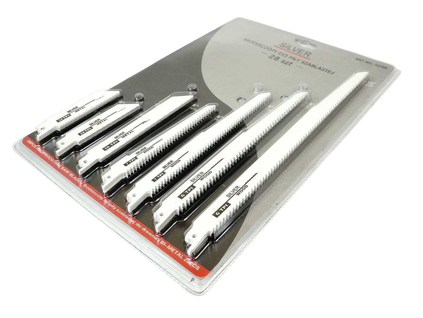 W zestawie znajduje się 12 szt. brzeszczotów do metalu i 16 szt. do drewna: