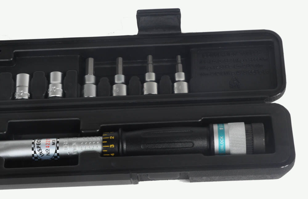 Klucz z płynną regulacją momentu dokręcania wyposażony w mechanizm blokujący, zapobiegający omyłkowemu przestawieniu się klucza i czytelną skalę. Rączka klucza profilowana w celu zwiększenia komfortu operatora. Klucz dynamometryczny z nasadkami umieszczony w plastikowym, praktycznym pudełku.