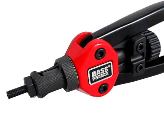 - Ręczna nitownica do nitonakrętek Bass Polska z zestawem trzech wymiennych końcówek w systemie metrycznym oraz trzech końcówek w systemie calowym i kompletem nitonakrętek.