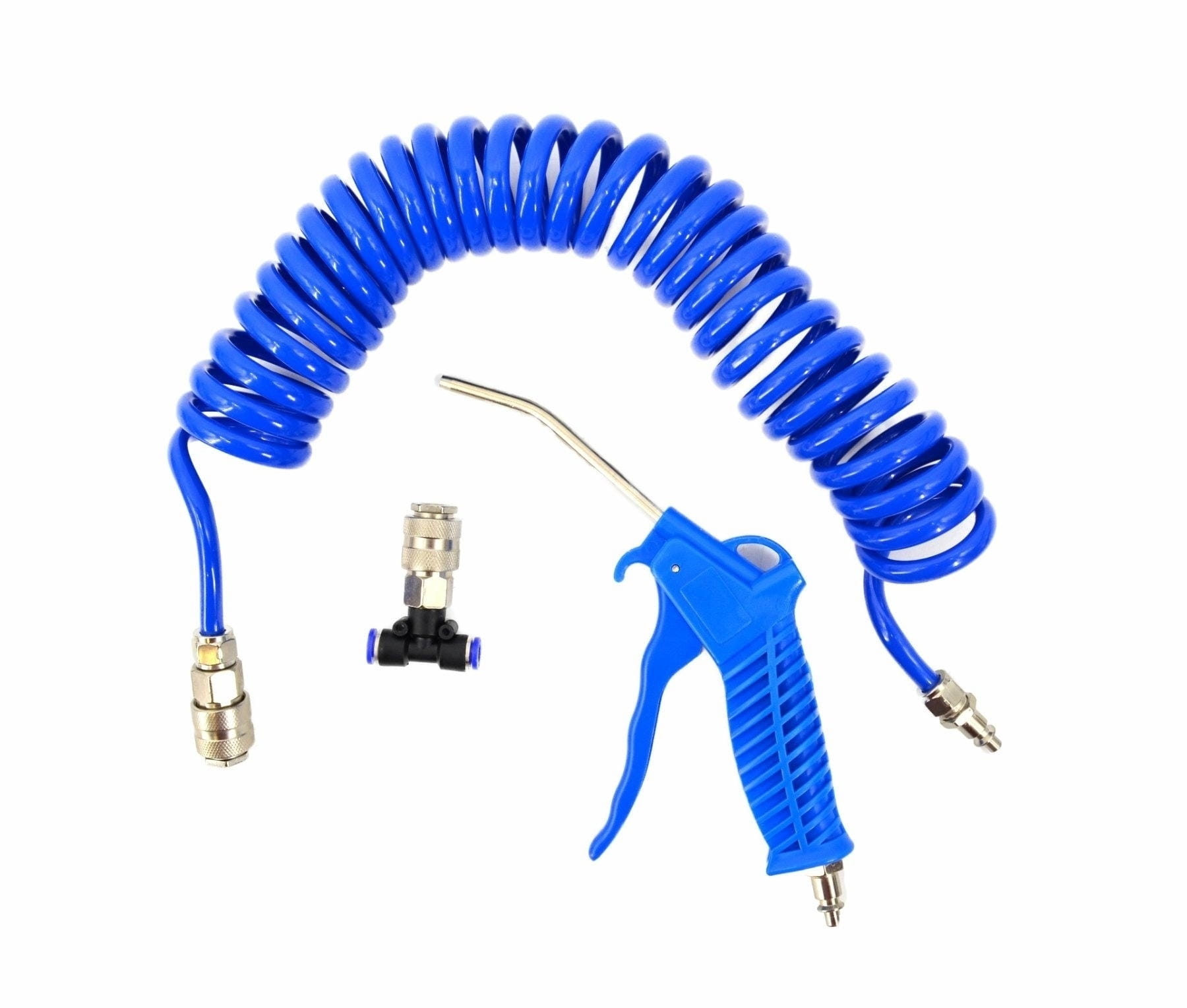 Pistolet w zestawie z trójnikiem oraz przewodem spiralnym 5m do podłączenia do kompresora. Ułatwia wydmuchiwanie zanieczyszczeń z trudno dostępnych miejsc. Idealny do zastosowania przy usuwaniu brudu i pyłu w samochodzie, do czyszczenia innych narzędzi. Wygodny uchwyt i mały ciężar zapewniają przyjemną i łatwą pracę. Spiralny przewód pozwoli na dotarcie do trudno dostępnych miejsc. Montowany w system pneumatyczny ciężarówki przy użyciu dołączonego do zestawu trójnika.