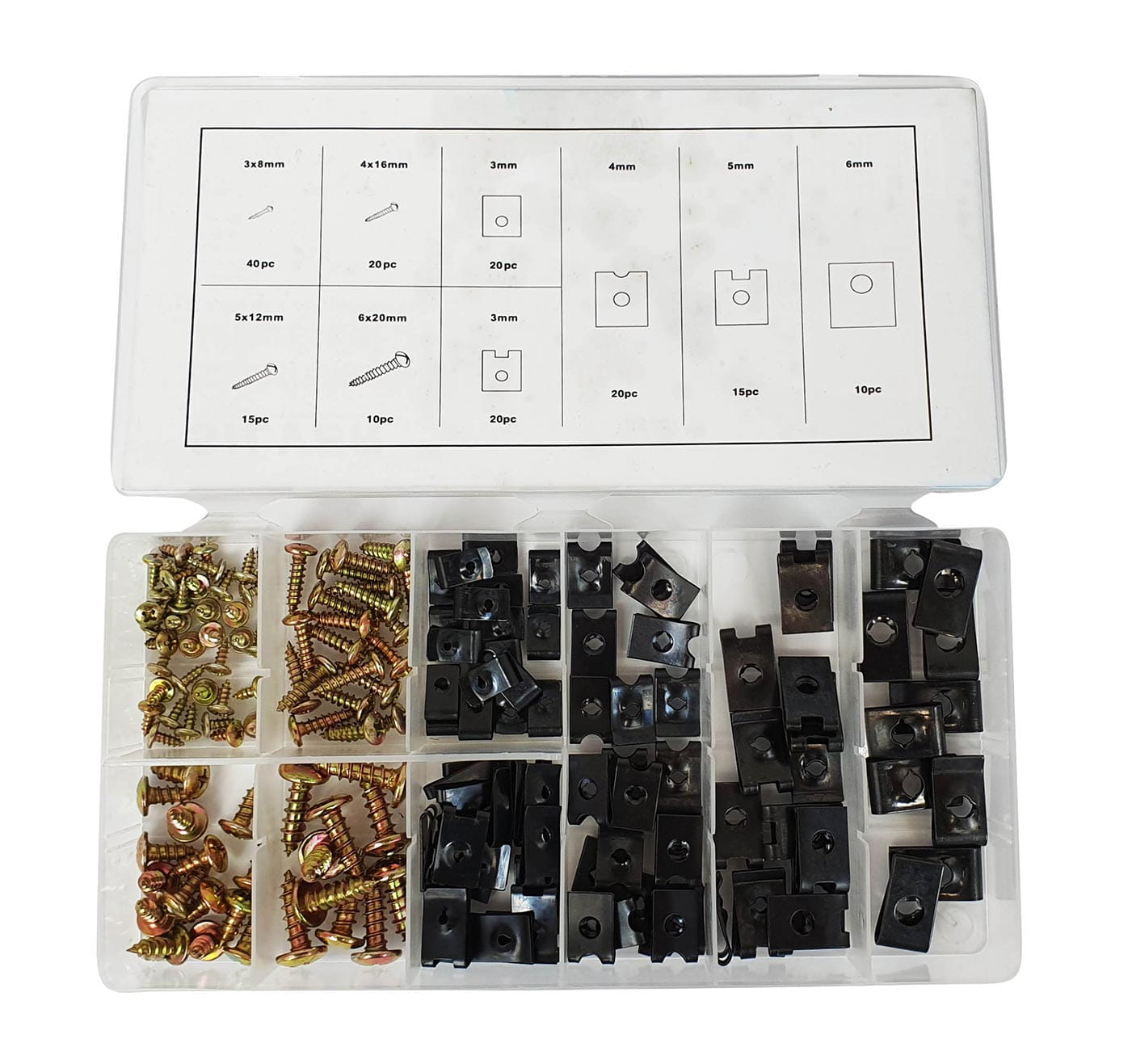 Doskonały zestaw do wkrętów i podkładek do karoserii składający się z 170 sztuk wkrętów i podkładek do karoserii, o rozmiarach od M 3 × 8 mm do M 6 × 20 mm. Wkręty i podkładki umieszczone są w wygodnym sortowniku.