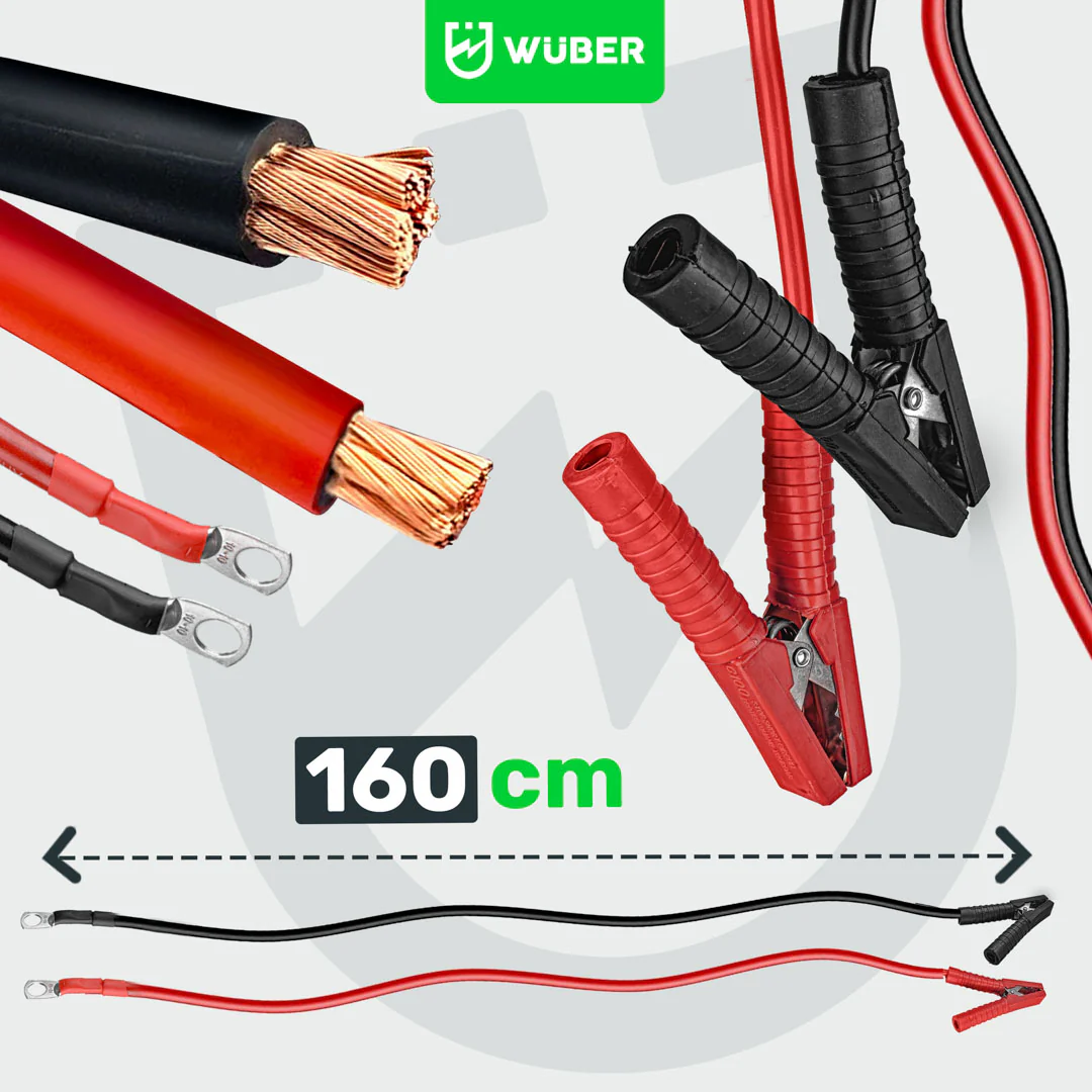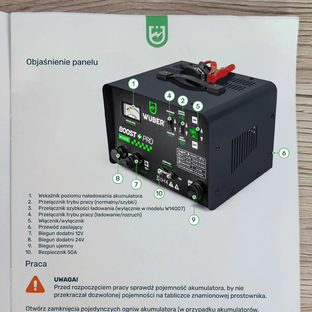 Długość przewodów 1,6 m i kompaktowe wymiary (36x30x26 cm) ułatwiają użytkowanie. Bezpiecznik 50A oraz wyraźne przyciski i wskaźniki zapewniają bezpieczeństwo i intuicyjną obsługę.
