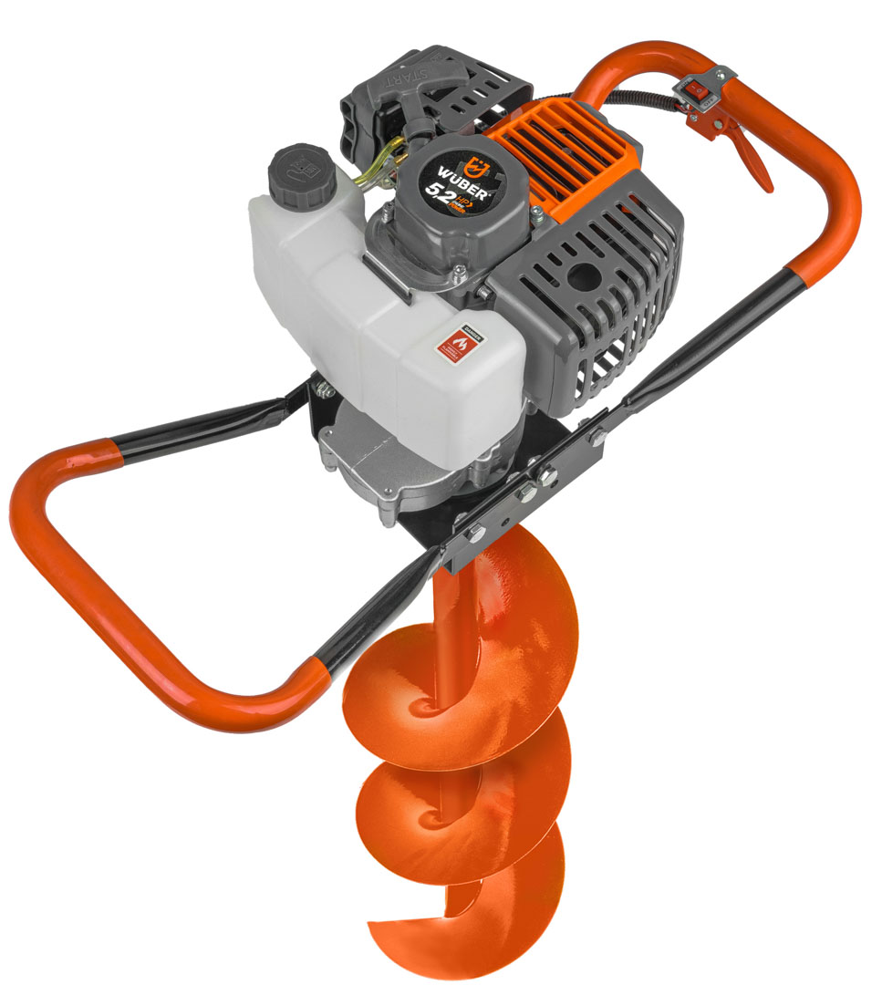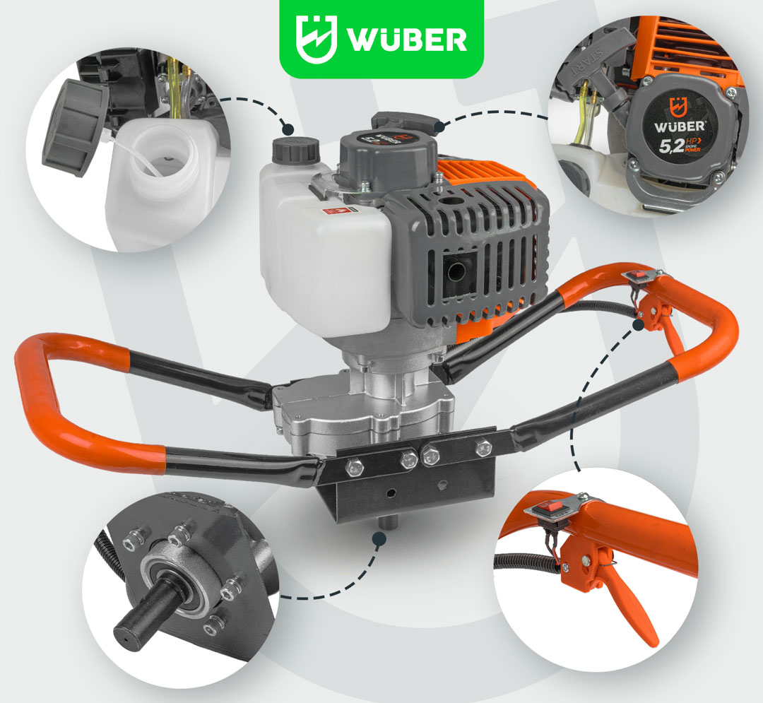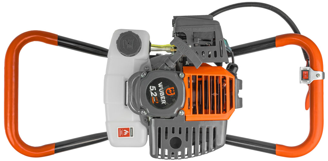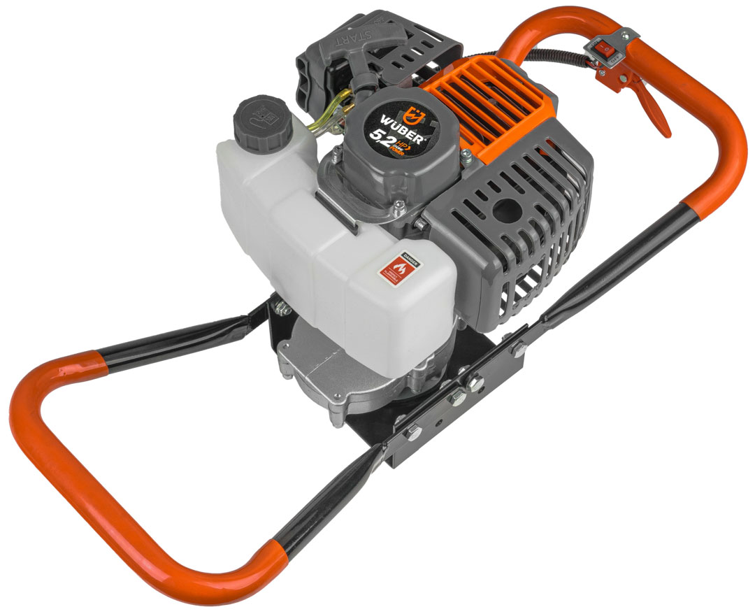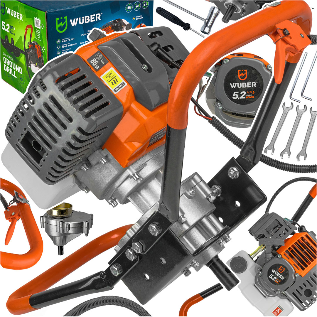 Producent: WUBER Rodzaj silnika: dwusuwowy Maksymalna moc: 5,2KM / 3,8kW Mieszanka: 1:25 Obroty na biegu jałowym: 3000 rpm Obroty silnika: 11000 rpm Pojemność skokowa: 62cm³ Kierunek obrotu: prawy Maksymalna średnica wiertła: 300mm Stopień przełożenia: 1:30 Pojemność zbiornika paliwa: 1000ml