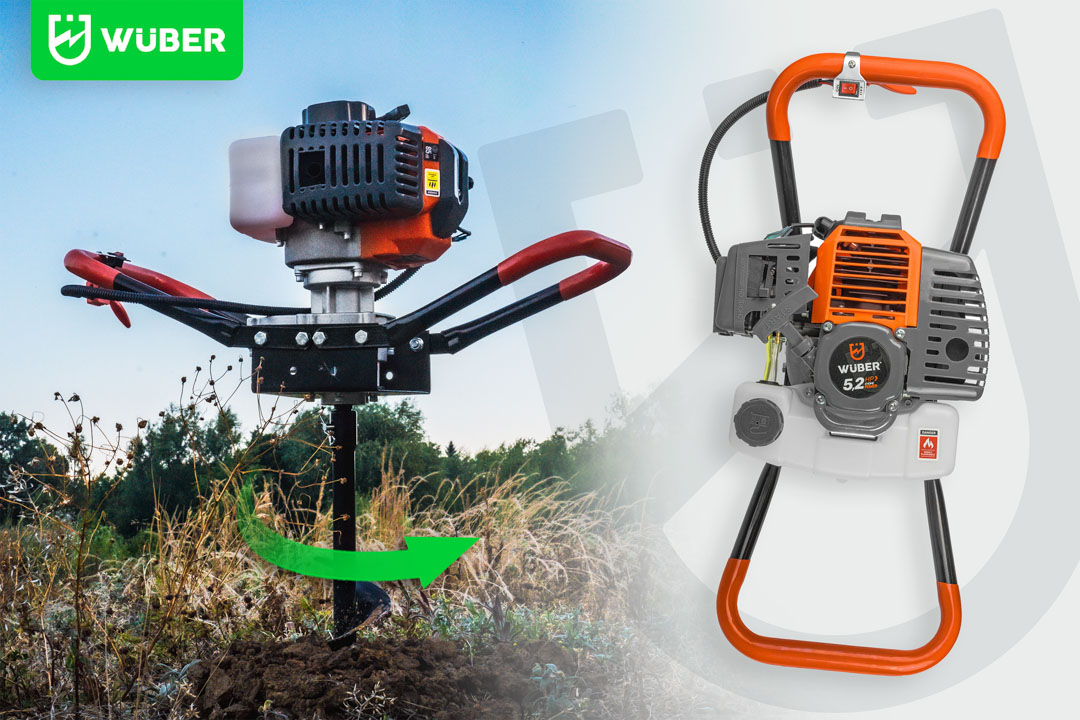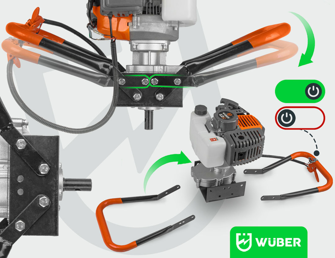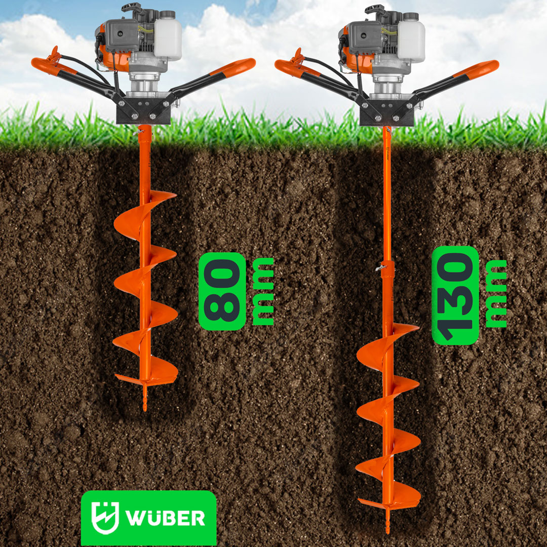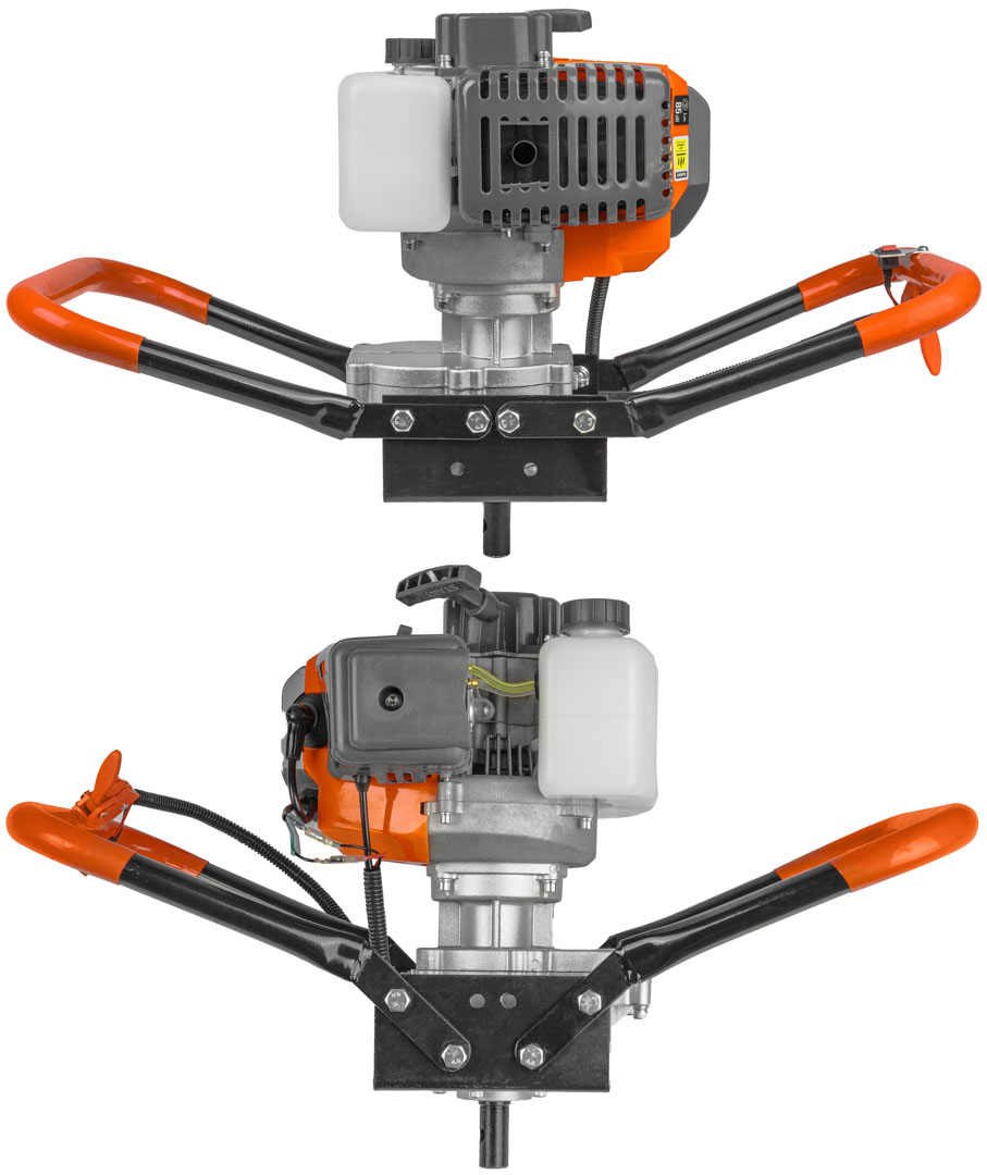 Producent: WUBER Rodzaj silnika: dwusuwowy Maksymalna moc: 5,2KM / 3,8kW Mieszanka: 1:25 Obroty na biegu jałowym: 3000 rpm Obroty silnika: 11000 rpm Pojemność skokowa: 62cm³ Kierunek obrotu: prawy Maksymalna średnica wiertła: 300mm Stopień przełożenia: 1:30 Pojemność zbiornika paliwa: 1000ml