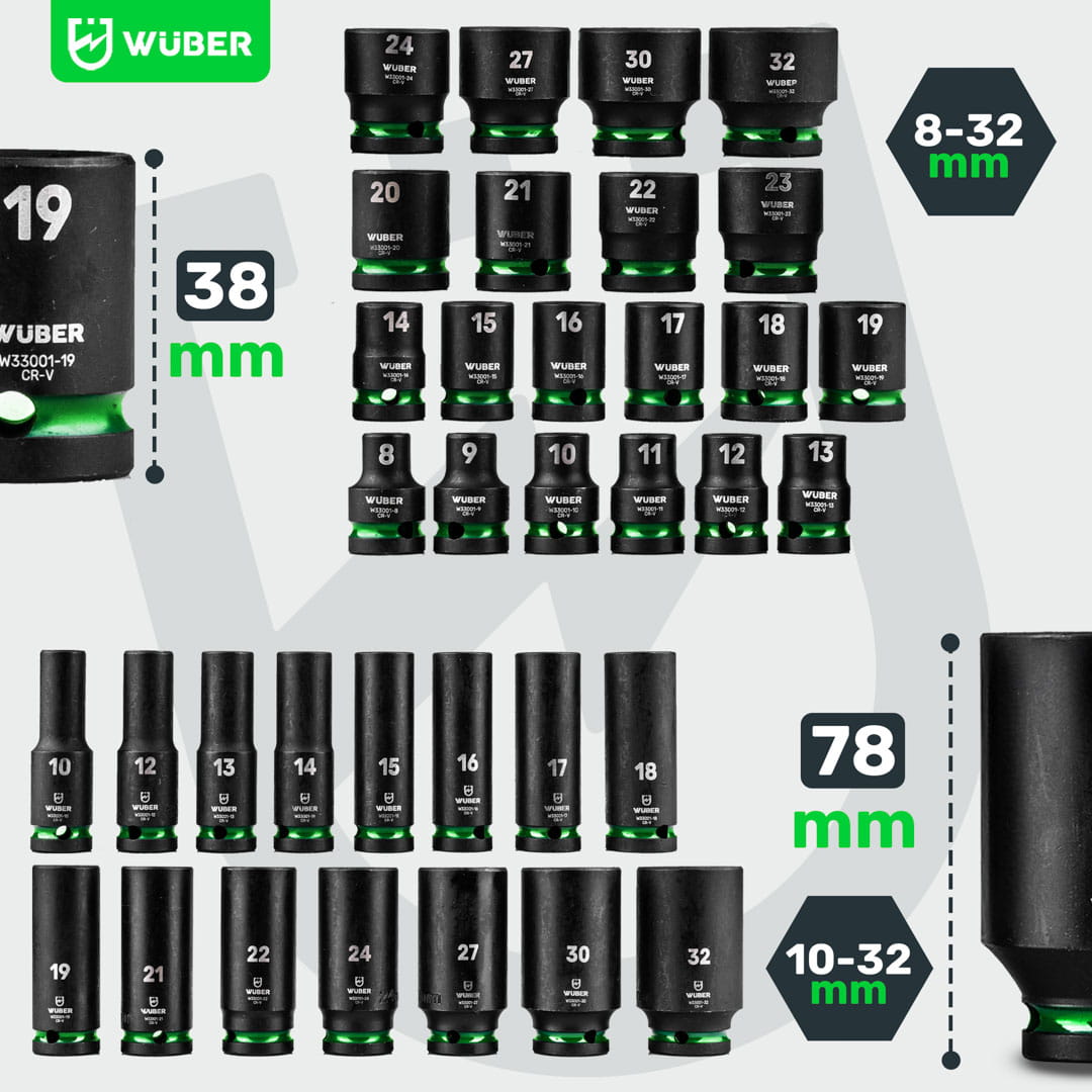 Rozmiary nasadek krótkich: 8mm, 9mm, 10mm, 11mm, 12mm, 13mm, 14mm, 15mm, 16mm, 17mm, 18mm, 19mm, 20mm, 21mm, 22mm, 23mm, 24mm, 27mm, 30mm, 32mm